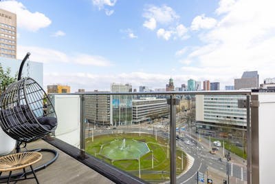 Wonen in het mooiste penthouse van Rotterdam? Dat kan nu op het Weena! Geniet binnen van een geweldig ruim appartement met buiten een fenomenaal uitzicht over de stad. Vanaf het balkon zie je Rotterdam op z’n best: van het ontwaken van de stad op een werkdag tot aan de stad van het bruisende nachtleven in het weekend. Zie jij jezelf al zitten in deze leuke hangstoel kijkend over het Hofplein?